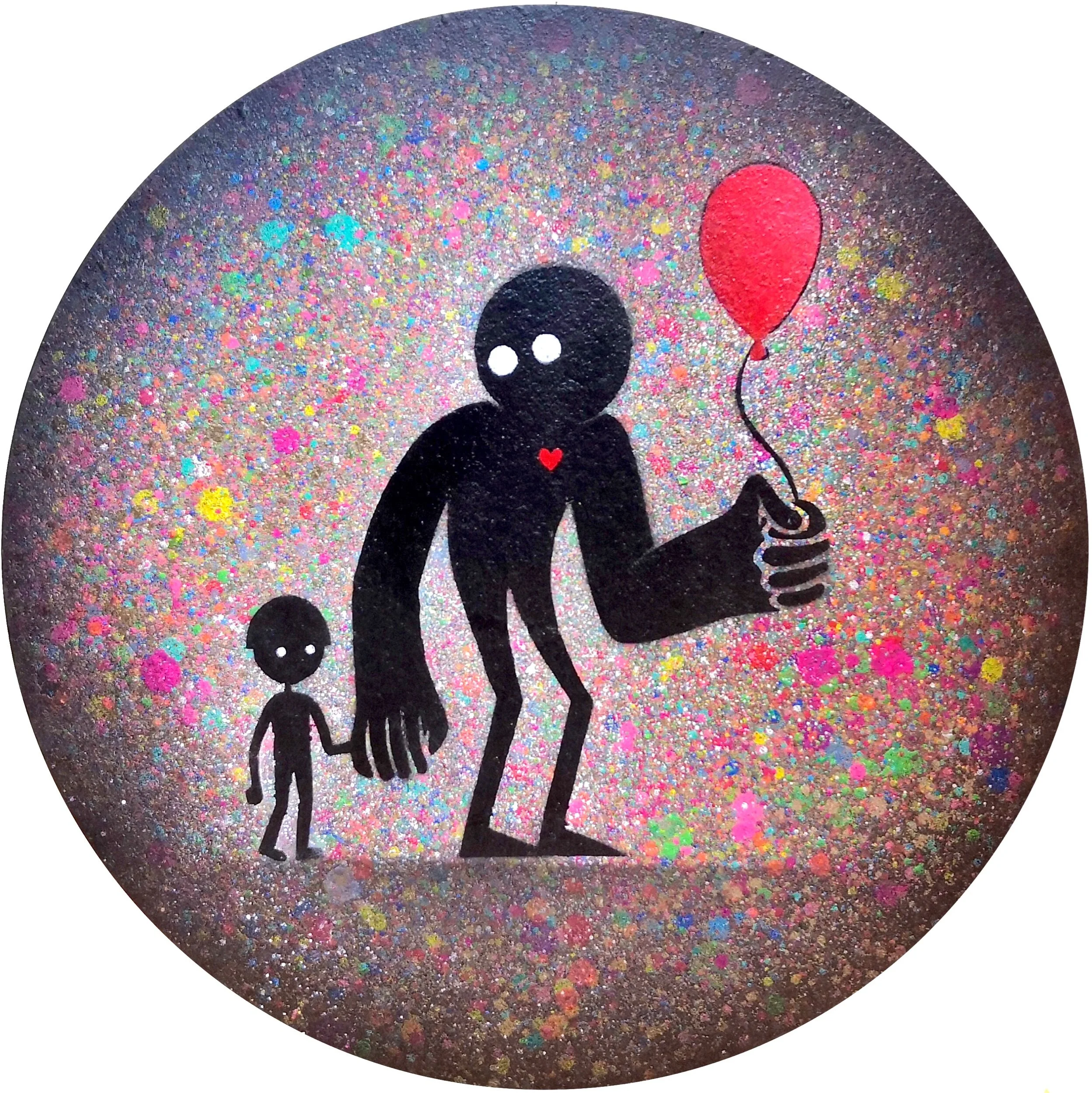 Peinture acrylique réalisée à la bombe et au pochoir sur toile ronde.